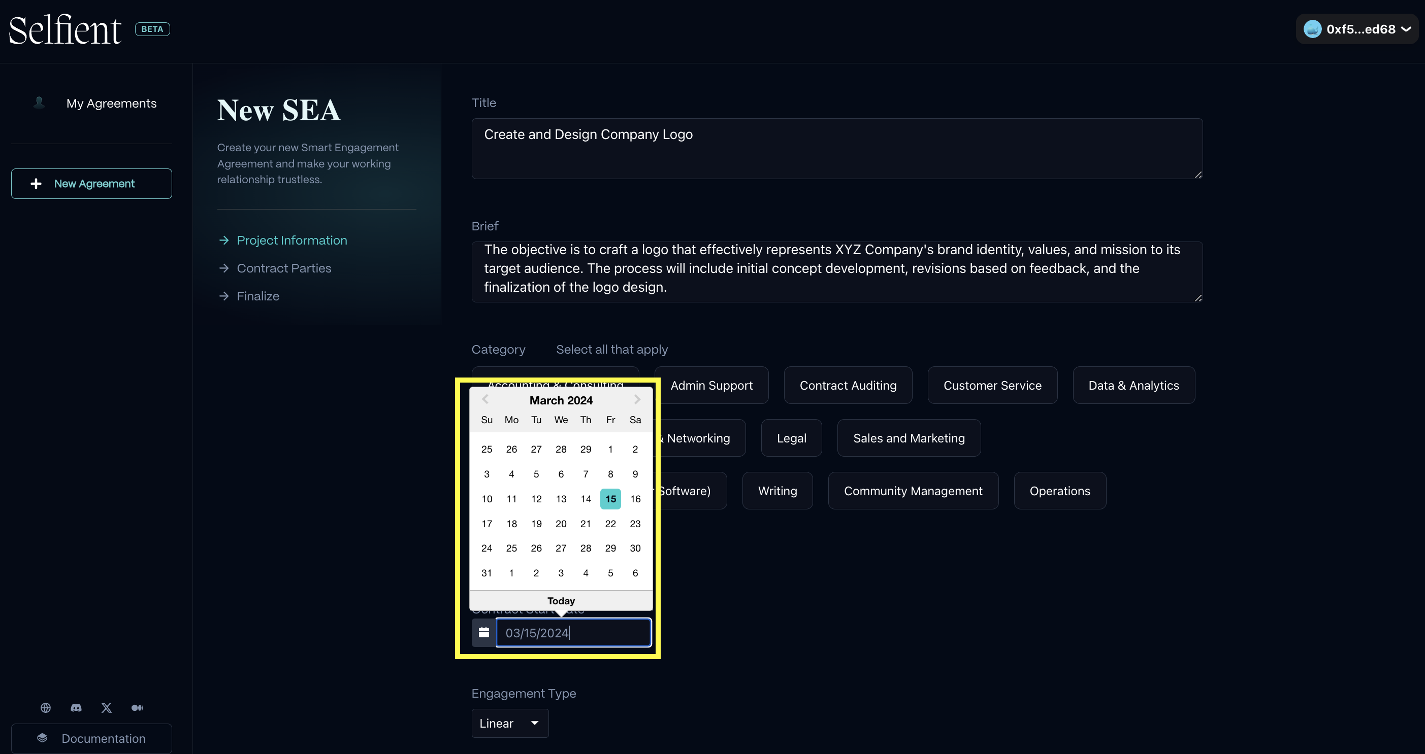 ### **1. After clicking "New Agreement," fill out the Contract Title, Brief, Project Category, and select the start date for your agreement.**